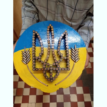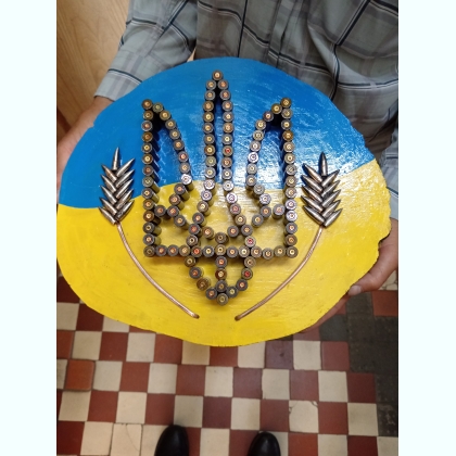 Герб України набитий на зрізі дерева стреляними гільзами.